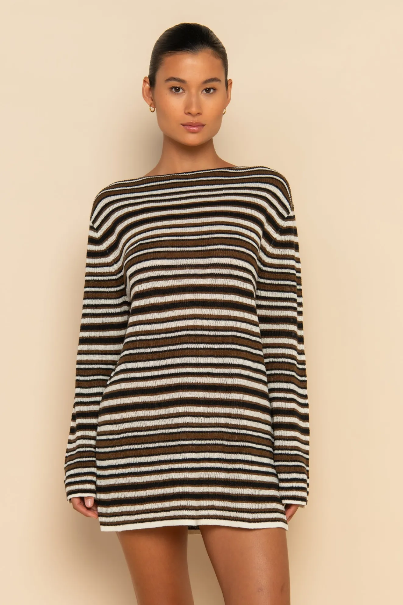 The Aura Mini Dress is the perfect transeasonal throw-on piece, crafted from 100% linen knit that will soften with wear. Adorned with an exclusive Elce stripe print, this medium-weight knit provides a slightly sheer finish. The dress features an asymmetric back cut-out, relaxed boxy fit and mini length, complemented by full-length flared sleeves and a boat neckline.